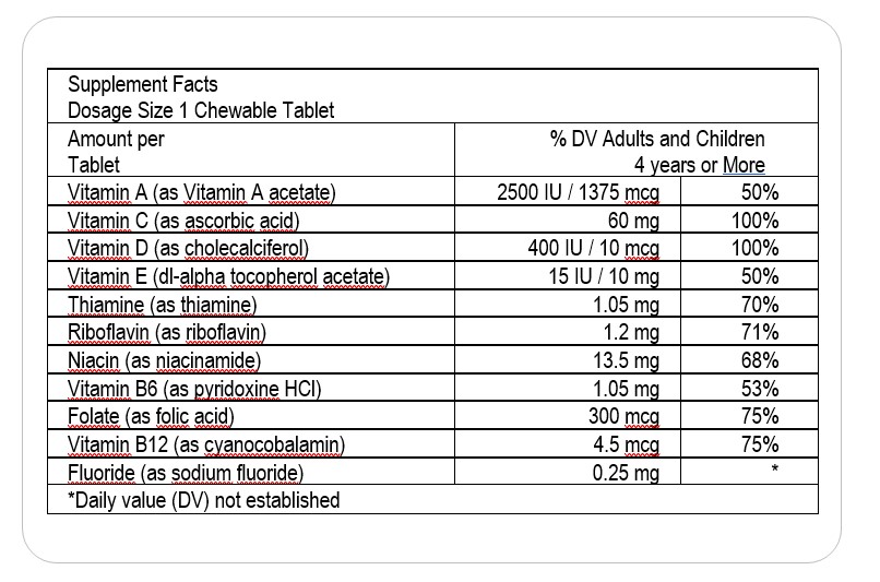 This is a supplement facts label displaying the dosage size for a chewable tablet designed for adults and children ages 4 years and up. The tablet includes various vitamins such as Vitamin A, Vitamin C, Vitamin D, Vitamin E, Thiamine, Riboflavin, Niacin, Vitamin B6, Folate, Vitamin B12, as well as fluoride. The percentages provided show the daily value (DV) of each nutrient.*