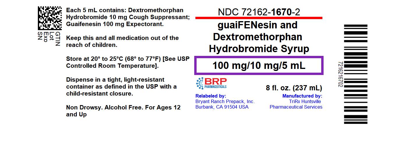 The following image provide visual information about the product associated with Guaifenesin And Dextromethorphan Hydrobromide NDC 72162-1670 by Bryant Ranch Prepack, such as packaging, labeling, and the appearance of the drug itself. This resource could be helpful for medical professionals, pharmacists, and patients seeking to verify medication information and ensure they have the correct product.