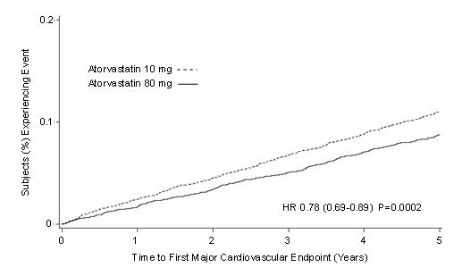 This text presents data from a study that compares the effects of two drugs, Horvastatin and Sorvastatin, on subjects with E vert. The percentage of subjects experiencing E vert is shown in the table, and a hazard ratio (HR) and p-value are given. The text also refers to a major cardiovascular endpoint and the time it took subjects to reach it.*