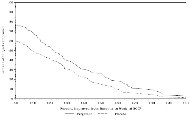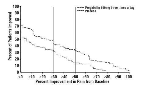 This text appears to be a graph or chart showing the percentage of patients who improved with different doses of Pregabalin and a placebo in relation to pain control. The doses mentioned are Pregabalin 100mg and 50mg taken three times a day. The graph seems to show the percentage of patients who experienced improvements at various levels of pain relief from baseline pain.*