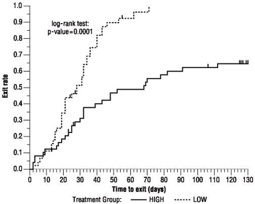 This text provides the results of a log-rank test, with a p-value of 0.0001. It also includes a table or chart displaying values for LT, LA, KS, AL, KLAL, MAAA, RAALA, SARAS, LARES, EAAT, as well as a numerical sequence from 10 to 130, likely representing time intervals in days. It mentions a "Treatment Group" with labels "HIGH" and "LOW".*