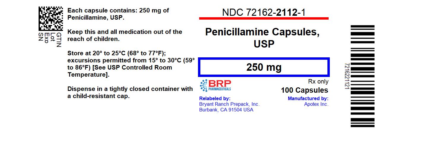 The text provided is a description of Penicillamine Capsules, USP. Each capsule contains 250 mg of Penicillamine, USP. It is important to keep this medication out of reach of children and store it at a temperature between 20°C to 25°C (68°F to 77°F), with excursions allowed from 15°C to 30°C (59°F to 86°F). The capsules should be dispensed in a tightly closed container with a child-resistant cap. The NDC number for this medication is 72162-2112-1. The capsules are manufactured by Apotex Inc and relabeled by Bryant Ranch Prepack, Inc.*