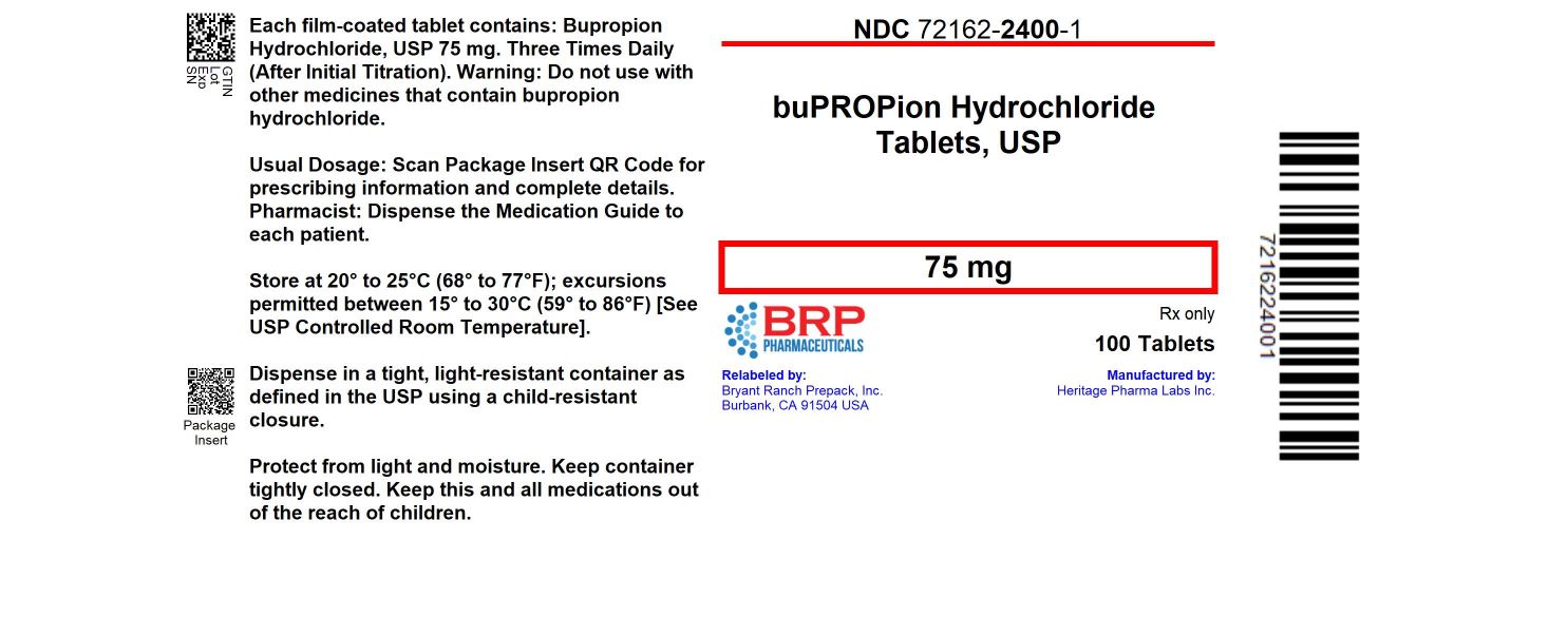 This is a description of Bupropion Hydrochloride tablets containing 75 mg of the active ingredient. The medication is to be taken three times daily after an initial titration. There is a warning not to use with other medicines containing bupropion hydrochloride. Patients should refer to the package insert QR code for prescribing information. It is advised to store the tablets at a temperature between 20°C to 25°C (68°F to 77°F) with excursions permitted between 15°C to 30°C (59°F to 86°F). The medication should be dispensed in a tight, light-resistant container with a child-resistant closure. It is essential to protect the tablets from light and moisture and keep the container tightly closed and out of reach of children. The tablets are labeled with NDC 72162-2400-1. The product is manufactured by Bryant Ranch Prepack, Inc., and relabeled by Heritage Pharma Labs Inc.*