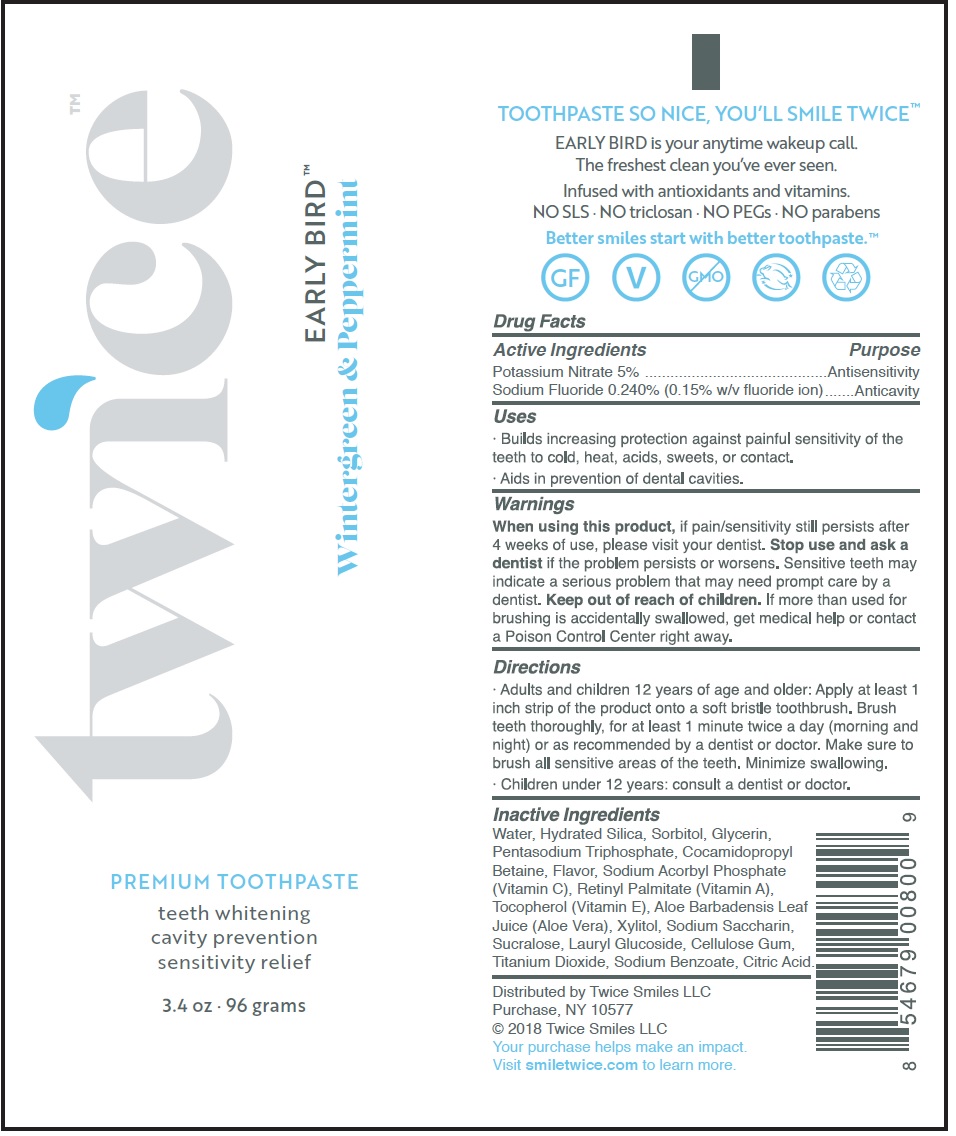 Early Birdâ„¢ Peppermint is a premium toothpaste that offers teeth whitening, cavity prevention, and sensitivity relief. It comes in a 3.4 oz-96 grams tube and is infused with antioxidants and vitamins for freshest clean wake-up call. The paste is NO SLS, NO triclosan, NO PEGs, and NO parabens. The product is effective in building increasing protection against painful sensitivity and preventing dental cavities. It contains potassium nitrate 5% for antisensitivity and sodium fluoride 0.240% (0.15% wiv fluoride ion) for anticavity. The paste is intended for use twice a day, and brushing should last at least one minute. It is suitable for adults and children aged 12 years and older. However, children under 12 years should consult a dentist or doctor. If sensitivity or pain persists after four weeks of use, consult a dentist. The toothpaste is distributed by Twice Smiles LLC in Purchase, NY, and is available on the Smiletwice.com website.*