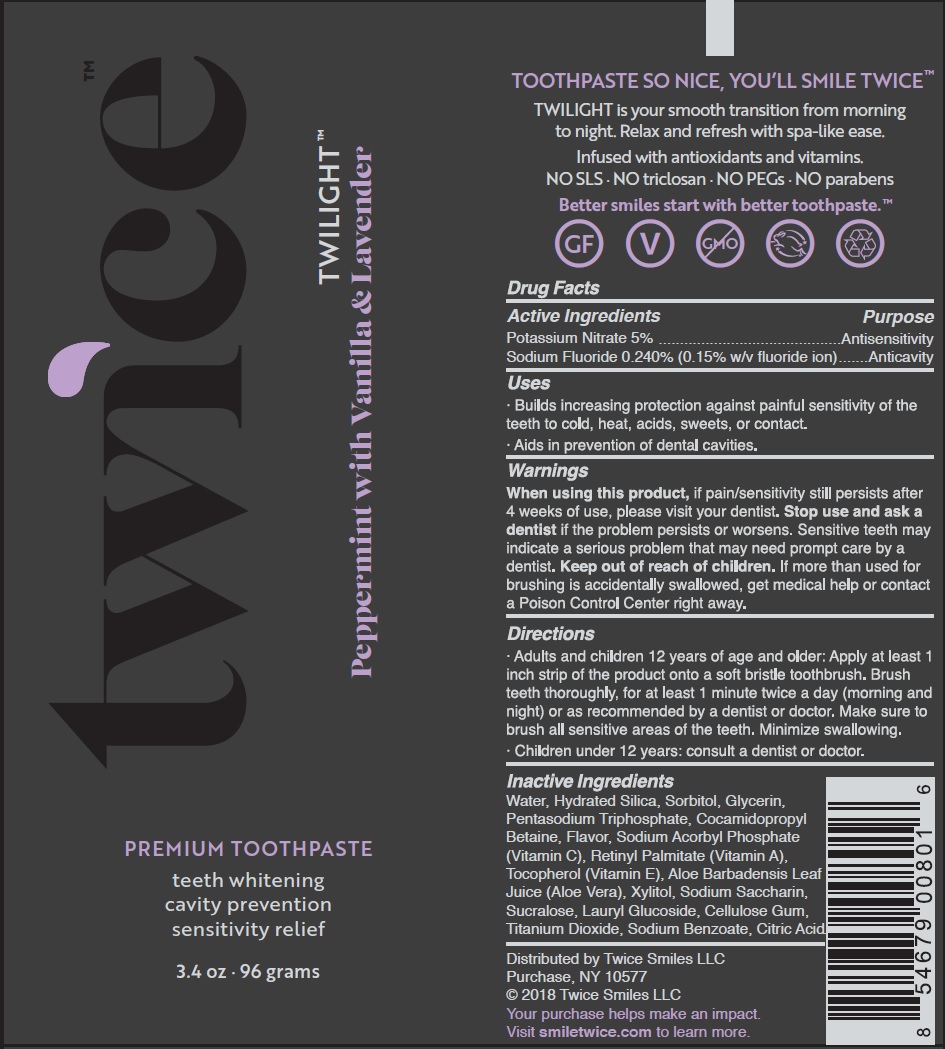 Twilight Toothpaste by Twice Smiles LLC is a premium dental care product that provides teeth whitening, cavity prevention, and sensitivity relief. It comes in a 3.40 oz-96 gram tube and is free from NOSLS, triclosan, PEGs, and parabens. Twilight Toothpaste features Potassium Nitrate (5%) for sensitivity relief and Sodium Fluoride (0.240%) for cavity prevention. It also contains active ingredients like antioxidants and vitamins for a spa-like experience. The product is recommended for those 12 years of age and older, and children under 12 should consult a dentist or doctor. The toothpaste's inactive ingredients include Water, Hydrated Silica, Sorbitol, Glycerin, and more. Your purchase of Twilight Toothpaste helps make an impact, visit smiletwice.com to learn more.*