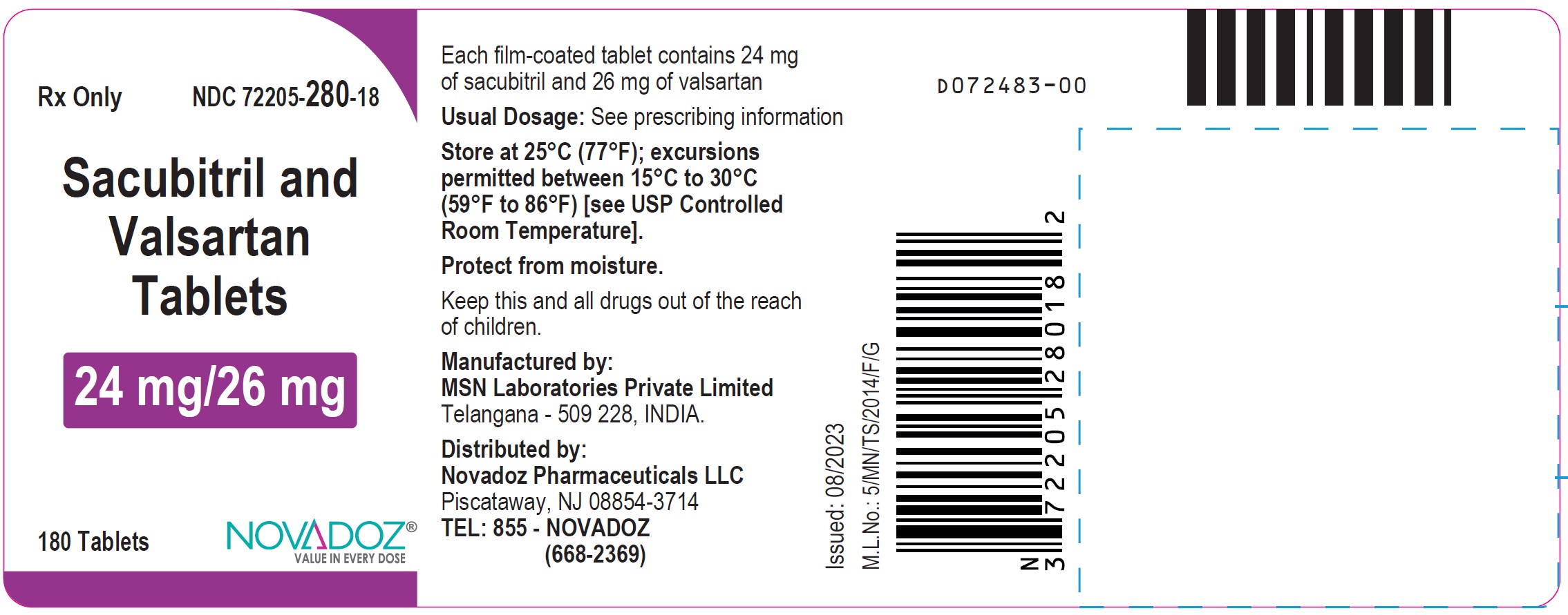 This is a description of Sacubitril and Valsartan tablets with a strength of 49 mg/51 mg, containing 180 tablets in the package. The tablets are film-coated and the usual dosage is mentioned in the prescribing information. The storage conditions are recommended to be at 25°C with excursions between 15°C to 30°C. The manufacturer is MSN Laboratories Private Limited in India, and the distributor is Novadoz Pharmaceuticals LLC based in Piscataway, NJ. It is vital to protect the tablets from moisture and keep them out of the reach of children. The tablets are available by prescription only.*