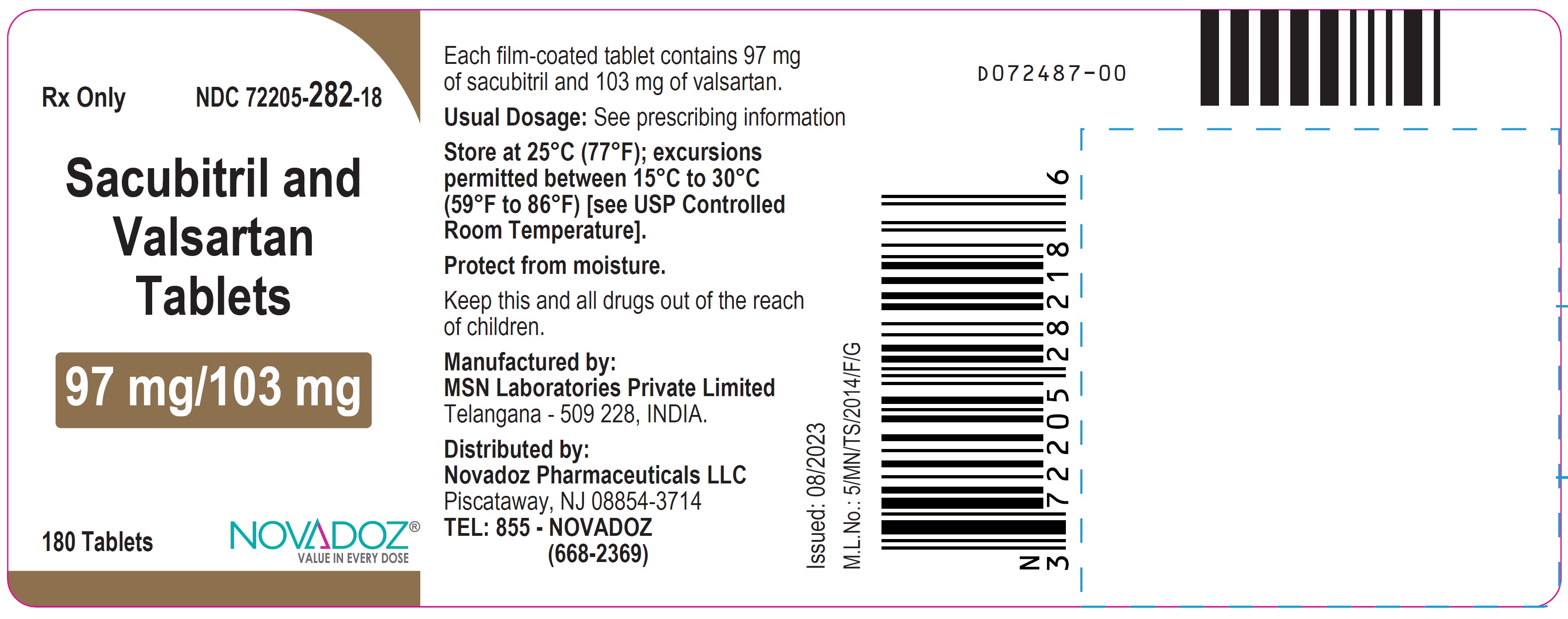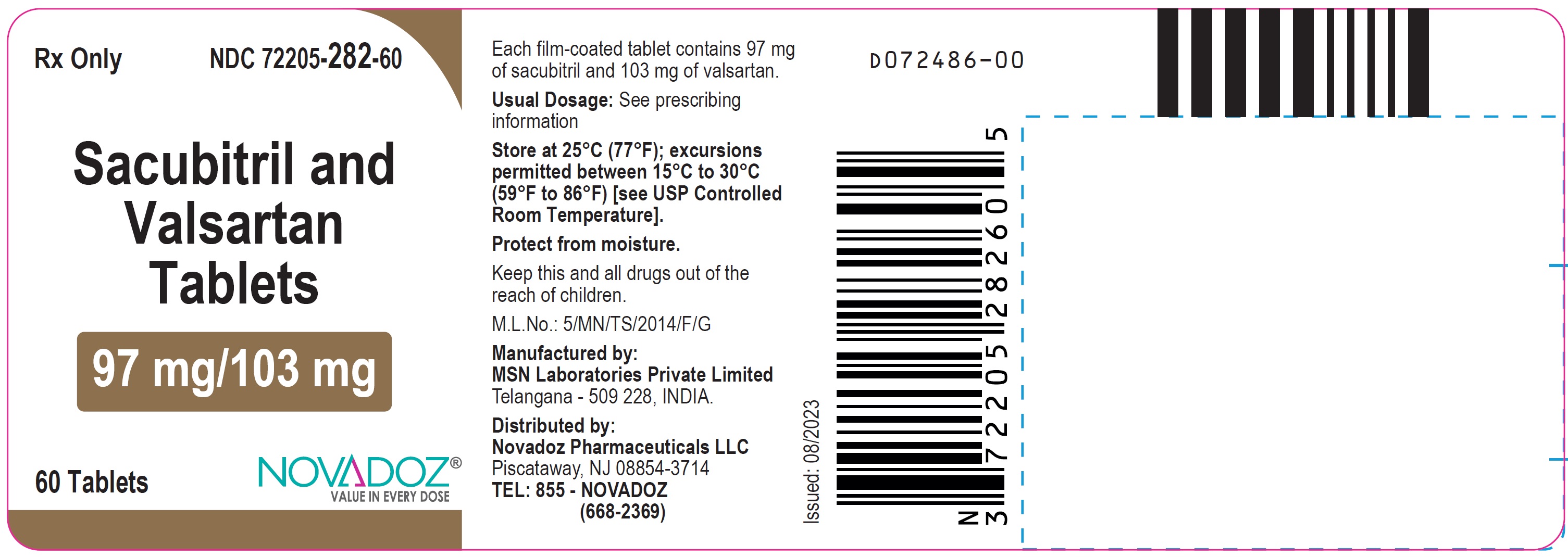 Each film-coated tablet contains 97 mg of sacubitril and 103 mg of valsartan. The usual dosage is indicated in the prescribing information. Store the tablets at room temperature between 59°F to 86°F and protect them from moisture. Keep the tablets out of reach of children. Manufactured by MSN Laboratories Private Limited in Telangana, India, and distributed by Novadoz Pharmaceuticals LLC in Piscataway, NJ. For more information, contact Novadoz Pharmaceuticals at 855- NOVADOZ.*
