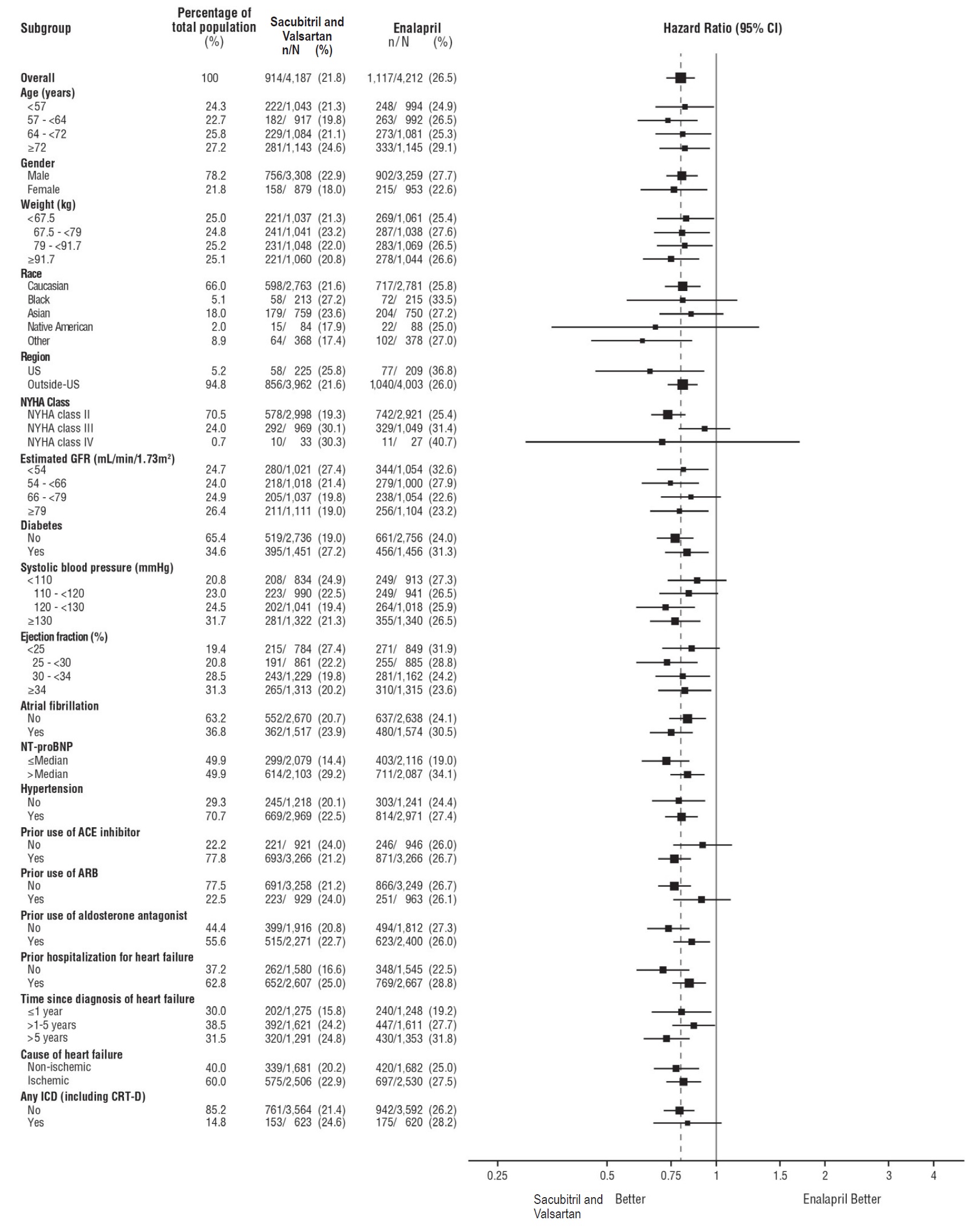 This is statistical data showing the percentage breakdown of different subgroups based on various factors such as age, gender, weight, race, region, NYHA class, estimated GFR, diabetes, systolic blood pressure, ejection fraction, atrial fibrillation, NT-proBNP, hypertension, and prior use of different medications in a study population. The data also includes the usage percentages of Sacubitril and Valsartan compared to Enalapril and their corresponding Hazard Ratio values.*