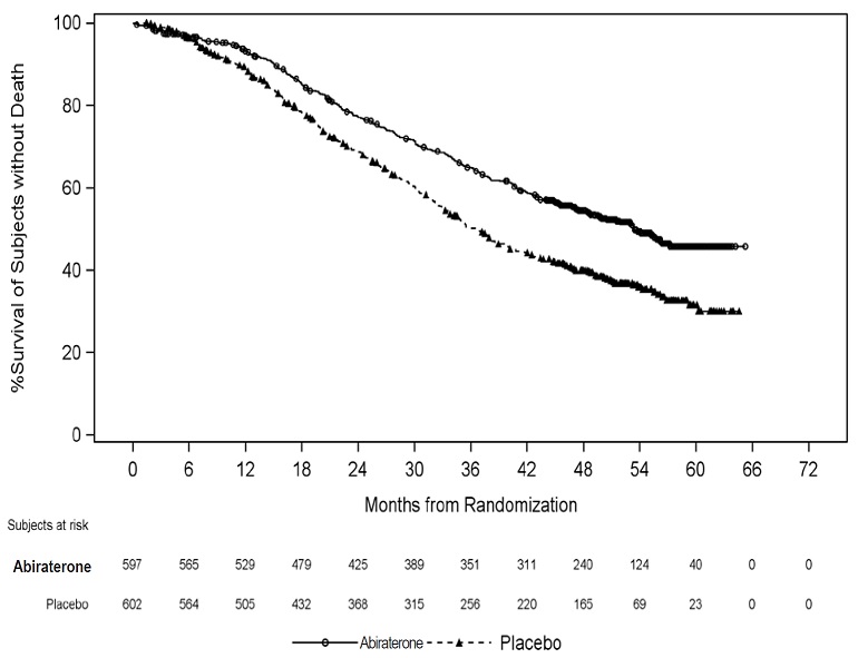 This text presents a visualization of the percentage of subjects without death, over a 60-month period, for the drugs Abiraterone and Placebo. The chart shows that Abiraterone had a higher percentage of subjects without death than the Placebo medication.*