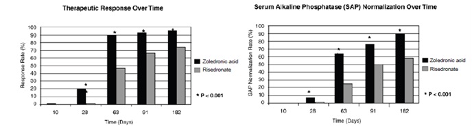 After a single treatment with zoledronic acid injection in Paget’s disease an extended remission period is observed. Specific re-treatment data are not available. However, re-treatment with zoledronic acid injection may be considered in patients who have relapsed, based on increases in serum alkaline phosphatase, or in those patients who failed to achieve normalization of their serum alkaline phosphatase, or in those patients with symptoms, as dictated by medical practice.
