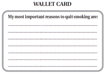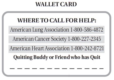 The text provides information about a wallet card that includes emergency helplines for American Lung Association, American Cancer Society and American Heart Association along with a Quitting Buddy or a friend who has quit to help people in need.*