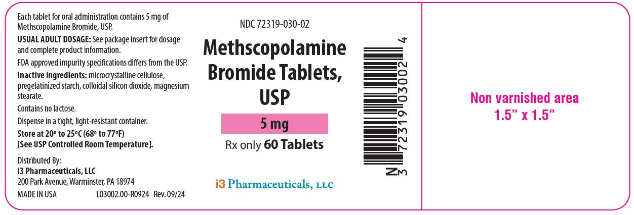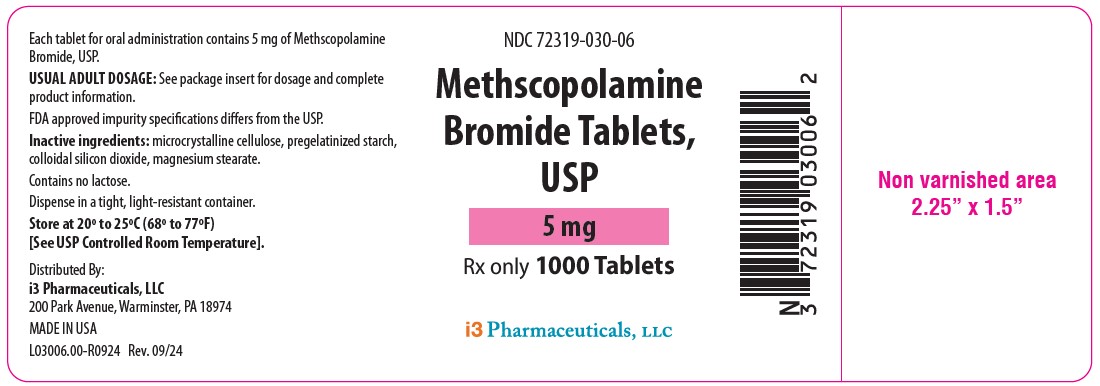 This text provides information about Methscopolamine Bromide tablets containing 5mg of the active ingredient. It lists the usual adult dosage, FDA-approved impurity specifications, inactive ingredients, and storage instructions. The tablets do not contain lactose and should be dispensed in a tight, light-resistant container. The product is distributed by i3 Pharmaceuticals, LLC in the USA. The package includes 1000 tablets and the NDC number is 72319-030-06. The tablets are for oral administration only.*