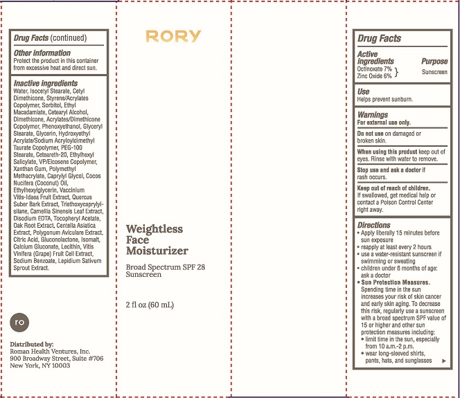 The following image provide visual information about the product associated with Rory Broad Spectrum Spf 28 Sunscreen Face Moisturizer NDC 72484-202 by Roman Health Ventures Inc., such as packaging, labeling, and the appearance of the drug itself. This resource could be helpful for medical professionals, pharmacists, and patients seeking to verify medication information and ensure they have the correct product.