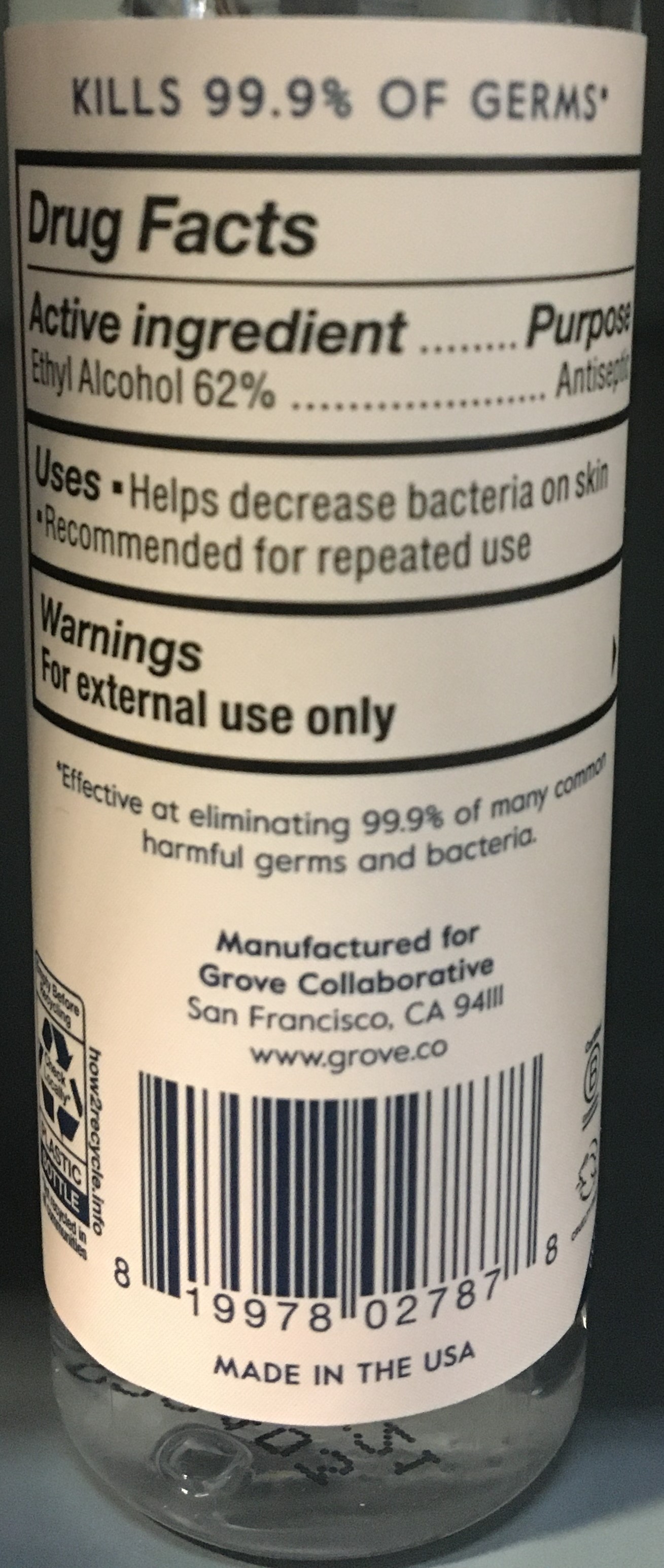 This product claims to kill 99.9% of germs and it contains an ingredient called MWhOl 620/0. It is manufactured for Grove Collaborative based in San Francisco, CA.*
