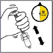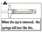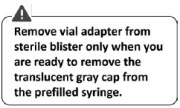 This is a vial adapter prefilled syringe with a luer opening. It has a purging rod and a luer-lok adapter with a spike tip. The diluent has a translucent gray cap. It also includes a vial injection needle with colored caps, a powder, and a needle protector. Additionally, it has a needle safety device.*
