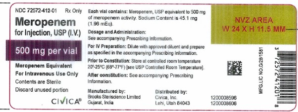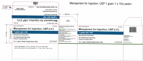 This is a description of a vial of Meropenem, USP equivalent to 1 gram of meropenem activity for intravenous use only. The sodium content is 90.2 mg (3.92 mEq). It provides instructions for administration, preparation, storage, and disposal. The product is manufactured by Brooks Steriscience Limited and distributed by Civica, Inc. Remember to consult the accompanying Prescribing Information for further details.*