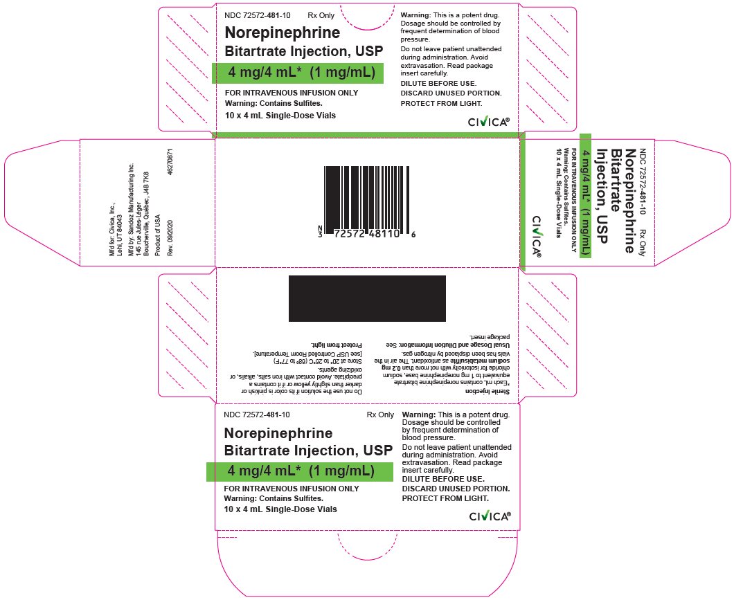The following 2 images provide visual information about the product associated with Norepinephrine Bitartrate NDC 72572-481 by Civica, Inc., such as packaging, labeling, and the appearance of the drug itself. This resource could be helpful for medical professionals, pharmacists, and patients seeking to verify medication information and ensure they have the correct product.
