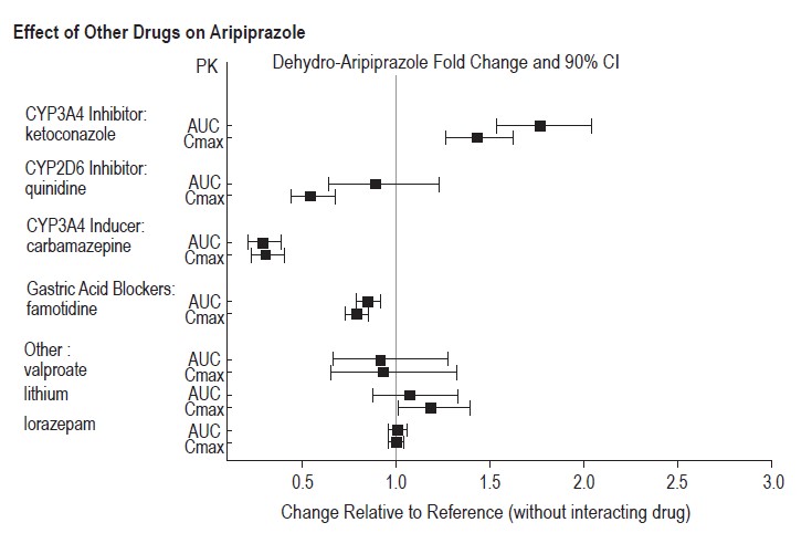 This is a list of drugs and their effects on aripiprazole, an antipsychotic medication. The chart shows the fold change and 90% C relative to the reference (without interacting drug) for AUC, Cmax, and Ucmax. The drugs listed include a CYP3A4 inhibitor (ketoconazole), CYP2DS inhibitor (quinidine), CYP3A4 inducer (carbamazepine), gastric acid blocker (famotidine), valproate, lithium, and lorazepam.*