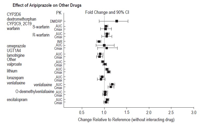 This text appears to be a table showing the effects of Aripiprazole, an antipsychotic drug, on the pharmacokinetics of other medications. It seems to be listing various drugs and their associated parameters, such as the area under the curve (AUC) and maximum concentration (Cmax), and how they are affected by Aripiprazole. The table also includes fold change values and confidence intervals for the drugs, although the meaning of these values is unclear without further context.*