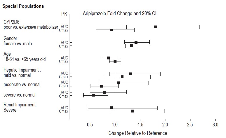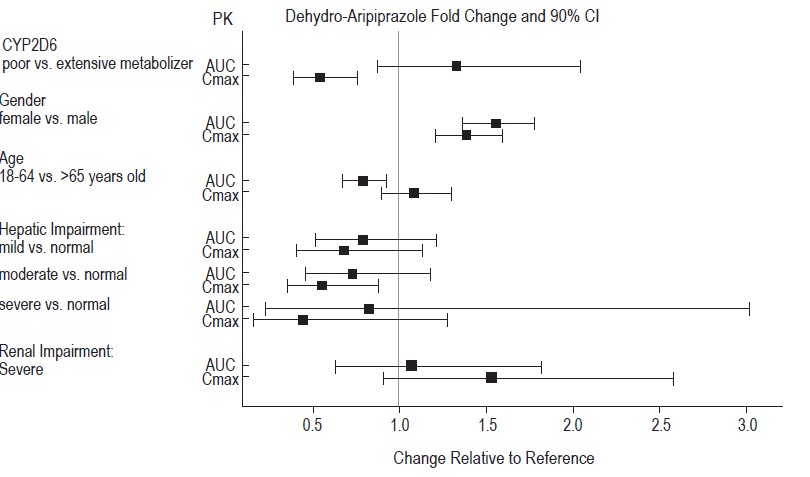 This appears to be a tabulated data with headings for different categories which include Special Populations, PK, CYP2D6, Gender, Age, Hepatic Impairment, Renal Impairment, and Aripiprazole Fold Change and 90% CI but without any actual values. It is likely a reference table for health professionals or research purposes related to pharmacokinetics and drug interactions. Therefore, a precise description cannot be provided without further information.*
