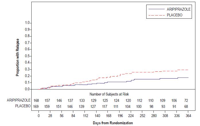 The text represents a graph that compares the proportion of subjects with relapse taking aripiprazole and placebo over time. The graph shows that the proportion of subjects with relapse is lower for aripiprazole compared to placebo. The text also includes the number of subjects at risk and days from randomization. There is not enough information to provide a full description of the study or its results.*