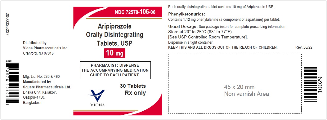 This is a description of a drug called Aripiprazole Orally Disintegrating Tablets, USP. It contains 10mg of Aripiprazole USP and is produced by Square Pharmaceuticals Ltd. It is distributed by Viona Pharmaceuticals Inc. and comes in a package of 30 tablets. The medication guide should be dispensed by the pharmacist to the patients. The drug should be stored in a tight container at a temperature of 20° to 25°C. The tablet contains 1.12 mg of phenyaanine, which is a component of aspartame. For complete prescribing information, the pharmacist should refer to the package insert. Children should not have access to this drug. Note: The text contains a lot of errors, which may affect the accuracy of the description.*