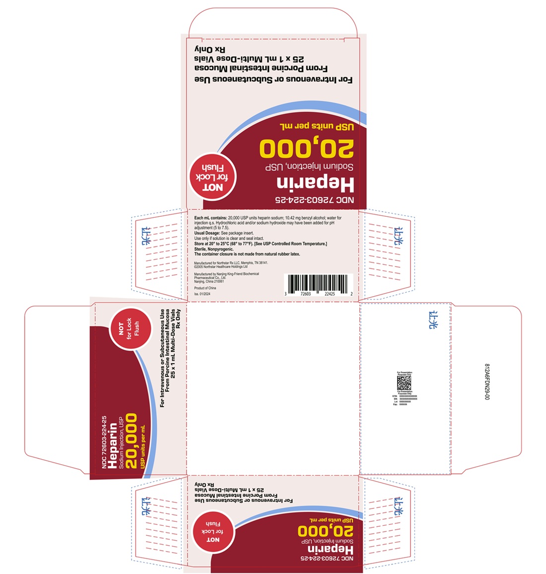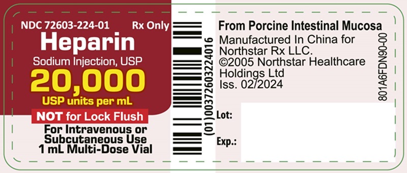 A medication labeled as "NDC 72603-224-01 Rx Only From Porcine Intestinal Mucosa" is described. This medication is a Sodium Injection, USP manufactured in China for Hepatirin by Northstar Rx LLC. It is a multi-dose vial containing USP units per mL intended for intravenous or subcutaneous use and is not meant for lock flush procedures. The expiration date is specified as 02/2024.*