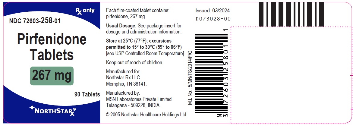What are the ingredients in pirfenidone film-coated tablets? Active ingredient: pirfenidone Inactive ingredients: croscarmellose sodium, colloidal silicon dioxide, hydroxypropyl cellulose, magnesium stearate, microcrystalline cellulose, polyvinyl alcohol, titanium dioxide, macrogol (polyethylene glycol) and talc. For more information call 1-800-206-7821. This Patient Information has been approved by the U.S. Food and Drug Administration. Manufactured for: Northstar Rx LLC Memphis, TN 38141. Manufactured by: MSN Laboratories Private Limited Telangana – 509 228, INDIA. Issued on: March 2024 |