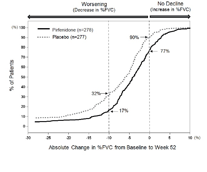 Figure 1 presents the cumulative distribution for all cut-offs for the change from baseline in %FVC at Week 52 for Study 1. For all categorical declines in lung function, the proportion of patients declining was lower on pirfenidone than on placebo. Study 2 showed similar results.