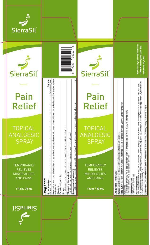 This text appears to be describing a pain relief product called SierraSil. It comes in a topical analgesic spray that temporarily relieves minor aches and pains. The product is sold in a 30mL container.*