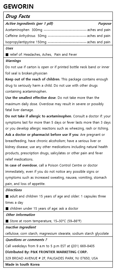 GEWORIN is a pain medication that contains 300mg of acetaminophen, 50mg of caffeine anhydrous, and 150mg of isopropylantipyrine per capsule. It is used to relieve headaches, aches, pain, and fever. The package warns not to use if the carton is open, if the printed bottle neck band or inner foil seal is broken, and if the user is allergic to acetaminophen or if they have symptoms that last for more than 5 days or fever lasts more than 3 days. Overdose may result in liver damage. Users should consult a doctor before using if they are pregnant or breastfeeding or if they have chronic alcoholism, a serious liver or kidney disease, or use any other medications. It is recommended to use the smallest effective dose and not to take more than the maximum daily dose. Users should call Poison Control Centre or doctor immediately in case of overdose. For adults and children 15 years of age and older, the recommended dose is 1 capsule three times a day. GEWORIN should be stored at room temperature.*