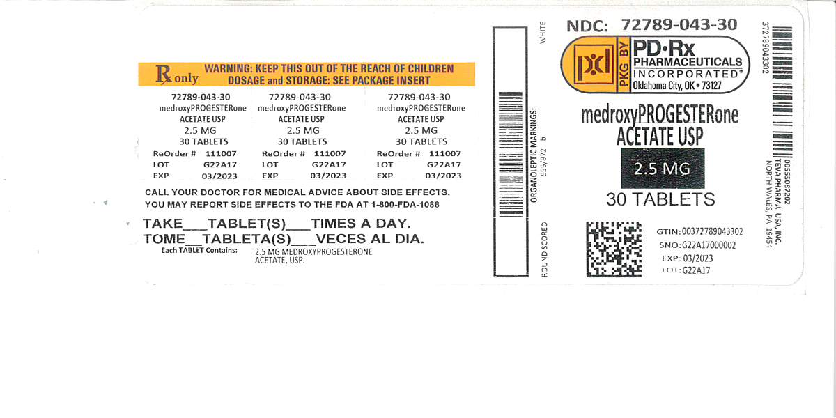 This is a medication information label for a product with NDC number 72789-043-30, containing 30 tablets of 2.5mg Medroxyprogesterone Acetate USP. The label provides dosage and storage information and warns to keep the medicine away from children. It also provides a reorder number and expiry date. The round, scored tablets are to be taken a certain number of times a day, and the label advises individuals to contact their doctor about any potential side effects. The text provides a phone number to report side effects to the FDA.*
