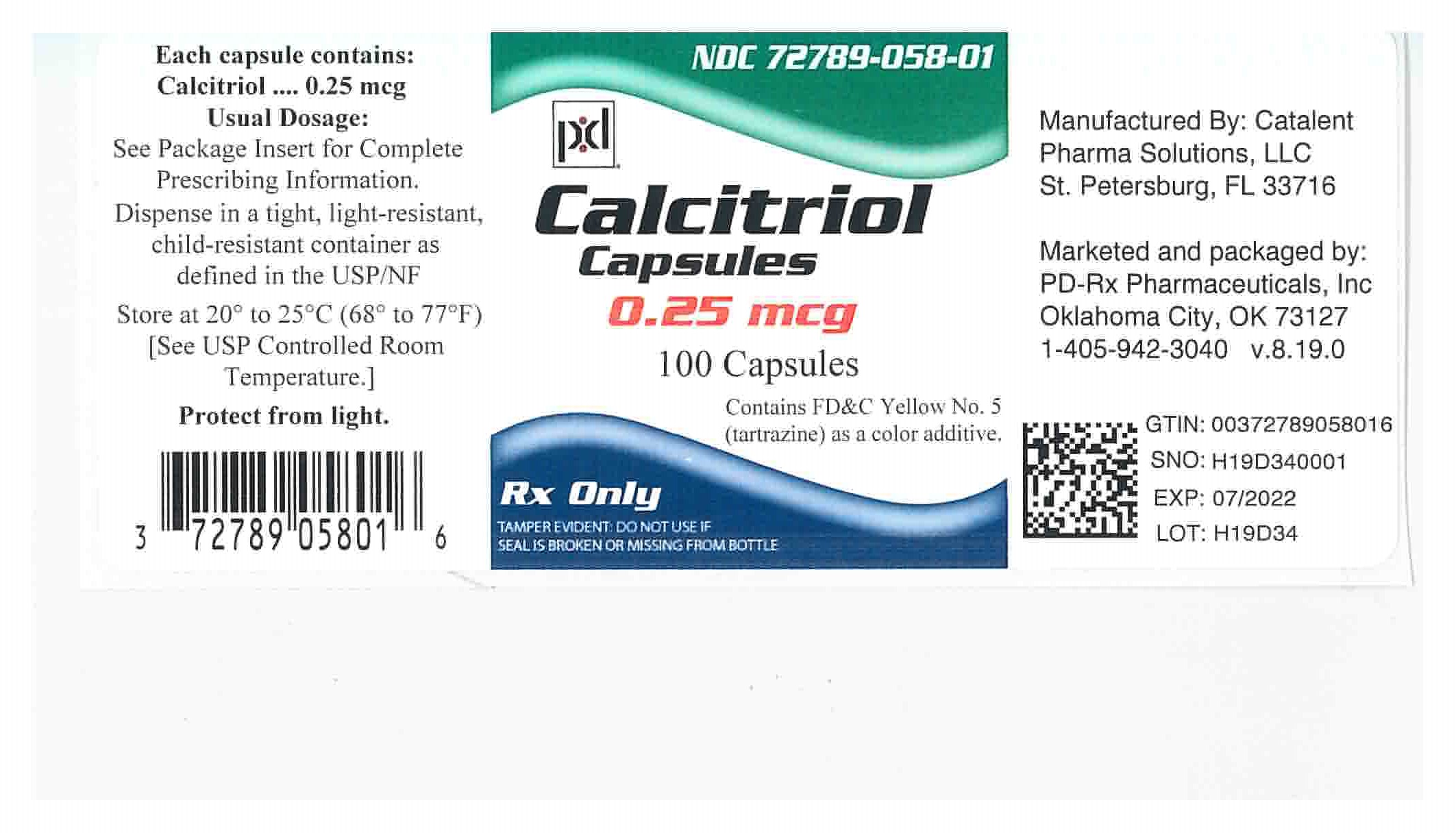 This is a medication container label for a product that contains Calcitriol at a concentration of 0.25 meg per capsule. The recommended dosage is not available in the text, but the label refers to a package insert for the complete prescribing information. The product is required for storage in a tight, child-resistant container that is also light-resistant. The manufacturer is Catalent Pharma Solutions, LLC located in St. Petersburg, FL, and the product is marketed and packaged by PD-Rx Pharmaceuticals, Inc. in Oklahoma City, OK, with an NDC code of 727839-058-01. The label warns against using the product if the seal is broken or missing from the bottle. The text suggests that the product contains FD&C Yellow No. 5 as a color additive, and the expiration date of the content in the bottle, as well the Lot number, are provided.*
