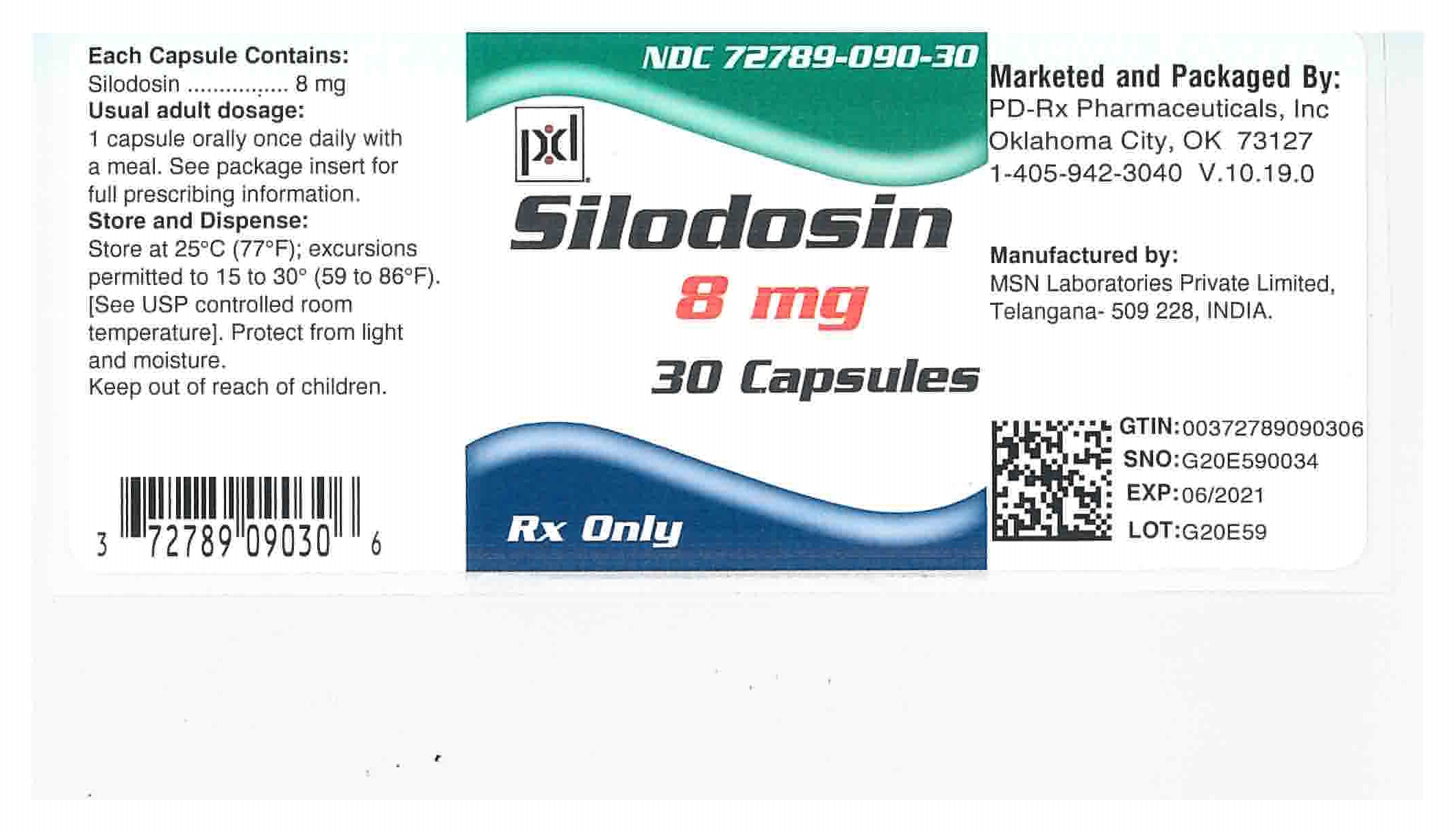 This is a medication with the active ingredient Silodosin, which is to be taken orally once a day with a meal. The usual adult dosage is not specified. The medication is contained in capsules, with each capsule containing 8mg of the active ingredient. The manufacturer is PD-Rx Pharmaceuticals, Inc. Full prescribing information is available in the package insert. The storage conditions recommended are to store at 25°C (77°F); excursions permitted to 15 to 30°C (59 to 86°F) and to protect from light and moisture. It is important to keep the medication out of reach of children. The product comes in a package of 30 capsules, with a unique identification code on the package.*