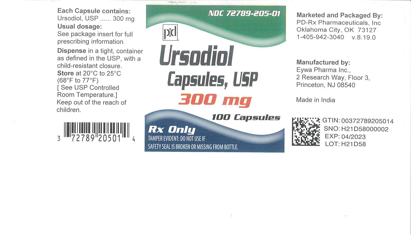 This is a medication containing 300 mg of Ursodiol and it is usually taken as per the dosage recommended on the package insert. The medicine needs to be stored in a container with a child-resistant closure at a temperature between 20°C to 25°C. The medication is manufactured by Eywa Pharma Inc. in India and marketed by PD-Rx Pharmaceuticals, Inc. in Oklahoma City. The packaging has a National Drug Code (NDC) of 72789-205-01 and a GTIN code of 00372789205014. The packaging has a tamper-evident seal which should not be broken or missing before consumption.*