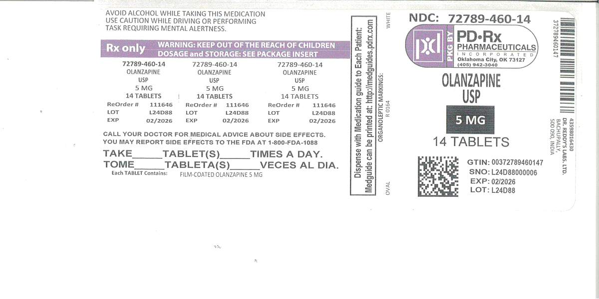 The following 2 images provide visual information about the product associated with Olanzapine NDC 72789-460 by Pd-rx Pharmaceuticals, Inc., such as packaging, labeling, and the appearance of the drug itself. This resource could be helpful for medical professionals, pharmacists, and patients seeking to verify medication information and ensure they have the correct product.