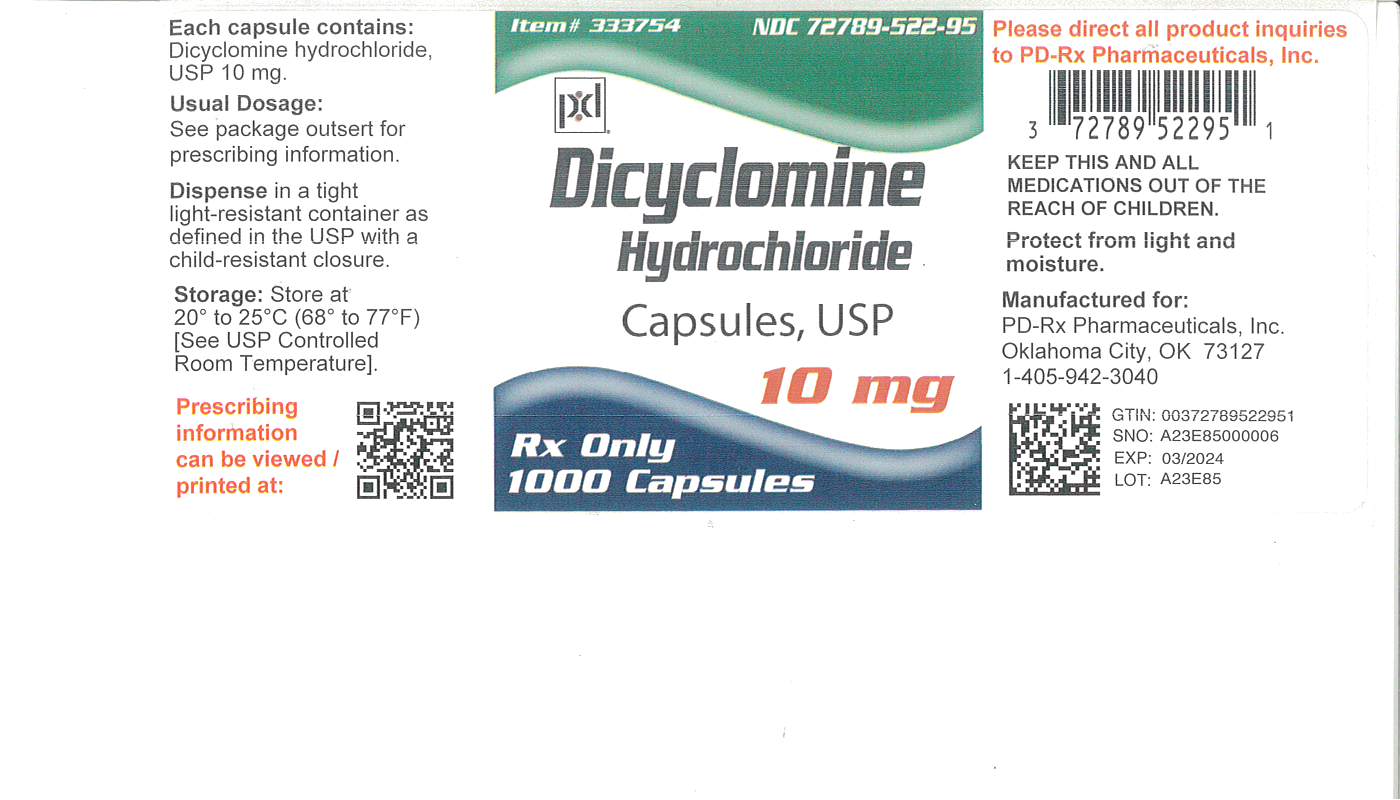 The following 2 images provide visual information about the product associated with Dicyclomine Hydrochloride NDC 72789-522 by Pd-rx Pharmaceuticals, Inc., such as packaging, labeling, and the appearance of the drug itself. This resource could be helpful for medical professionals, pharmacists, and patients seeking to verify medication information and ensure they have the correct product.