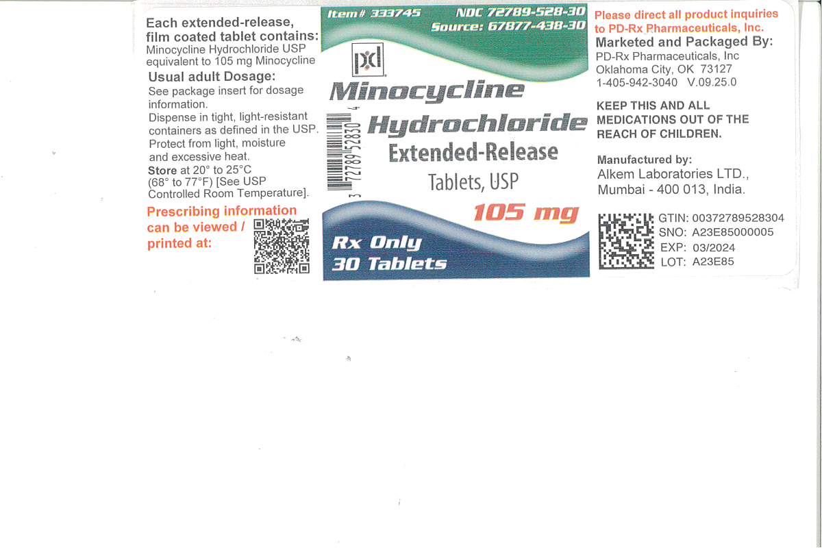 This is a description of Minocycline Hydrochloride extended-release film coated tablets containing 80 mg of Minocycline. The usual adult dosage and storage instructions are provided. The prescribing information is available for reference. The medication is marketed and packaged by PD-Rx Pharmaceuticals, Inc. in Oklahoma City, OK. The tablets are distributed by Alkem Laboratories LTD. in Mumbai, India. The product information includes the expiration date (03/2024) and lot number (A23E85).*