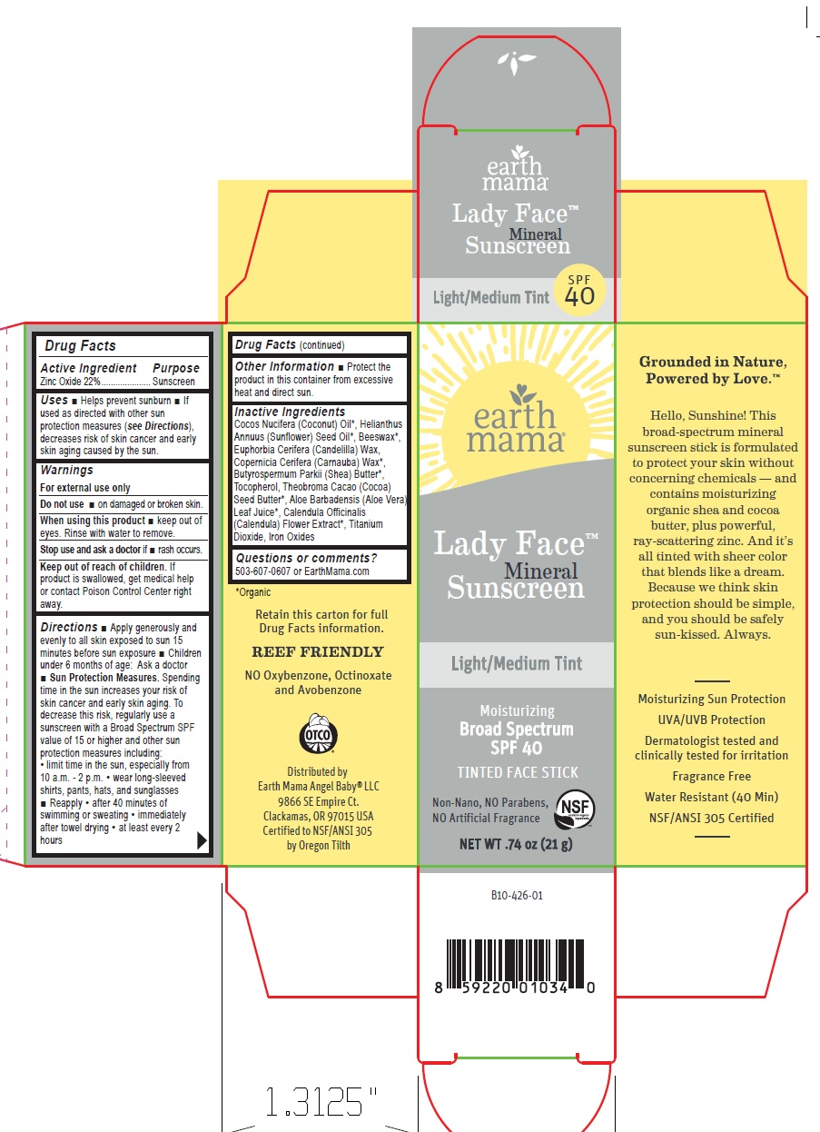 This is a sunscreen stick called Lady Face™ with a light to medium tint. It contains 27% of Zinc Oxide and provides SPF 40 broad-spectrum mineral protection from the sun. It is filled with natural ingredients like shea butter and cocoa butter that soothe and hydrate the skin. There are no harmful substances like Oxybenzone, Octinoxate, and Avobenzone present, making it reef-friendly. The stick should be applied generously and evenly across the skin, and its effect lasts for 40 minutes of sweating or swimming. The product is designed, distributed, and certified by Earth Mama Angel Baby®LLC.*