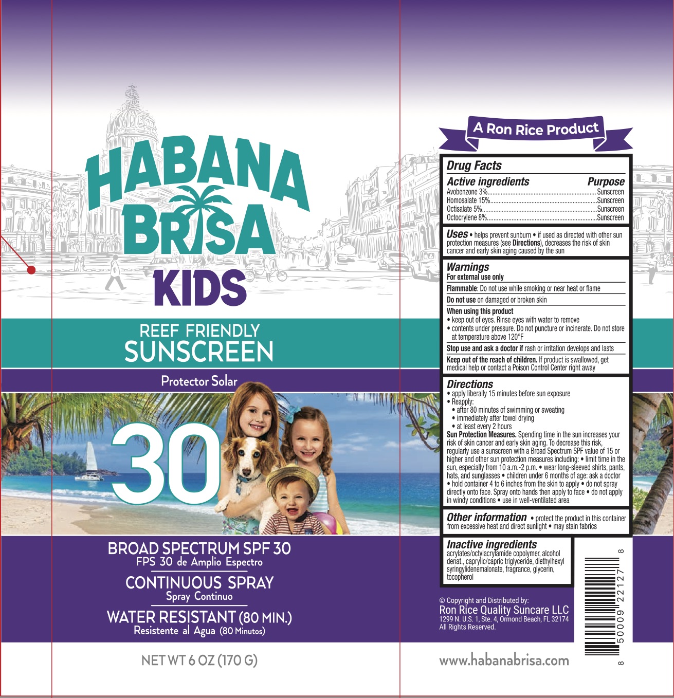 This is a Reef Friendly Sunscreen that is water-resistant for 80 minutes and provides broad-spectrum SPF 30 protection against sunburns and skin aging caused by the sun. The sunscreen is a continuous spray of 6 oz (170 g) and should be applied at least every 2 hours, after 80 minutes of swimming or sweating, and 15 minutes before sun exposure. It also includes instructions on other skin protection measures to take when spending time in the sun. The product includes warnings and drug facts and is distributed by Ron Rice Quality Suncare LLC.*