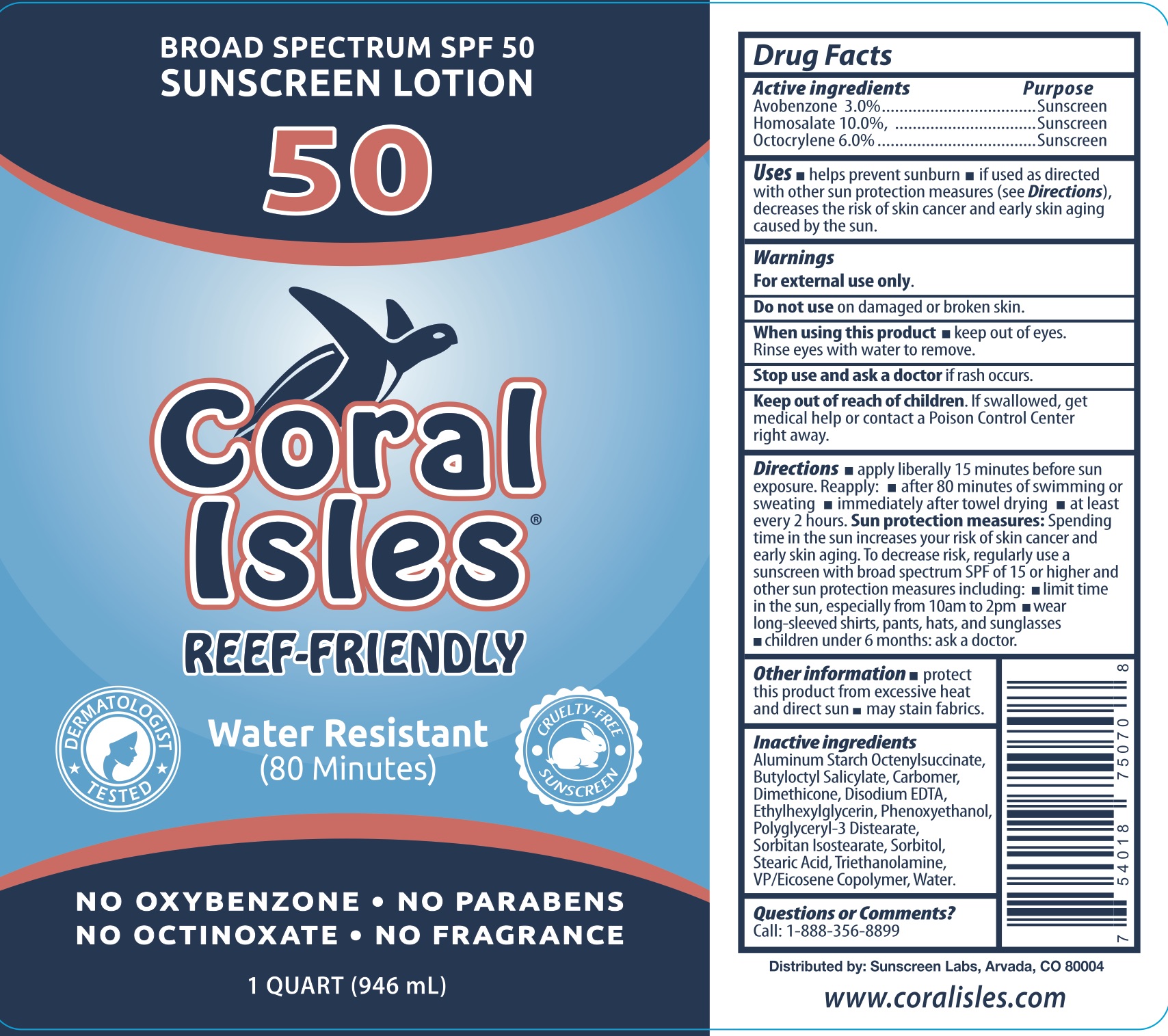 This is a drug facts label for a sunscreen lotion. The active ingredients include Avobenzone, Homosalate, and Octocrylene which helps to prevent sunburn and skin cancer caused by the sun. It is advised to keep the lotion away from eyes, discontinue use if a rash occurs and not use on damaged skin. The lotion has a broad spectrum SPF of 50 and is water-resistant for 80 minutes. The label also includes directions for use and information on the inactive ingredients. The product is distributed by Sunscreen Labs in Arvada, CO.*