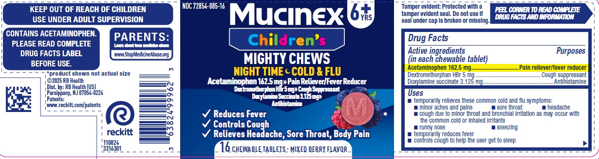 The following image provide visual information about the product associated with Mucinex Childrens Mighty Chews Night Time Cold And Flu NDC 72854-085 by Rb Health (us) Llc, such as packaging, labeling, and the appearance of the drug itself. This resource could be helpful for medical professionals, pharmacists, and patients seeking to verify medication information and ensure they have the correct product.