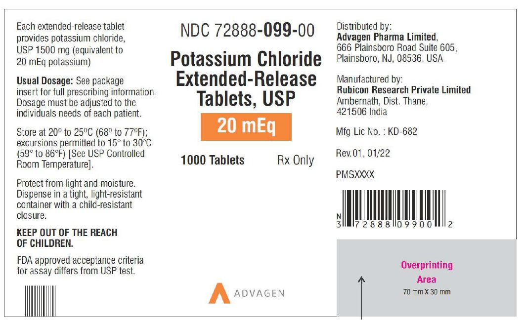This is a description for potassium chloride extended-release tablets. Each tablet provides 1500 mg of potassium chloride, which is equivalent to 20 mEq of potassium. The usual dosage should be determined based on the individual needs of each patient. The tablets should be stored at a temperature of 20° to 25°C, with excursions permitted between 15° to 30°C. They should be protected from light and moisture and dispensed in a tight, light-resistant container with a child-resistant closure. These tablets are FDA approved, and the manufacturer is Advagen Pharma Limited, located in Plainsboro, NJ, USA. They are distributed by Rubicon Research Private Limited in India.*
