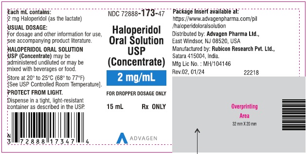 The following 5 images provide visual information about the product associated with Haloperidol NDC 72888-173 by Advagen Pharma Ltd, such as packaging, labeling, and the appearance of the drug itself. This resource could be helpful for medical professionals, pharmacists, and patients seeking to verify medication information and ensure they have the correct product.