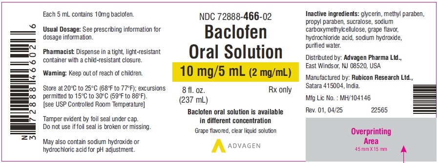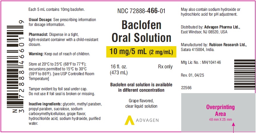 This text provides information about a Baclofen oral solution containing 10mg per 5mL. The usual dosage instructions can be found in the prescribing information. It should be kept in a light-resistant container, away from children, at a temperature range of 20 to 25 degrees Celsius. The solution includes inactive ingredients such as glycerin, methyl paraben, and propyl paraben. The NDC number is 72888-466-01, and the brand is ADVAGEN. This grape-flavored liquid may contain sodium hydroxide or hydrochloric acid for pH adjustment. It is distributed by Advagen Pharma Ltd. in the USA and manufactured by Rubicon Research Ltd. in India.*