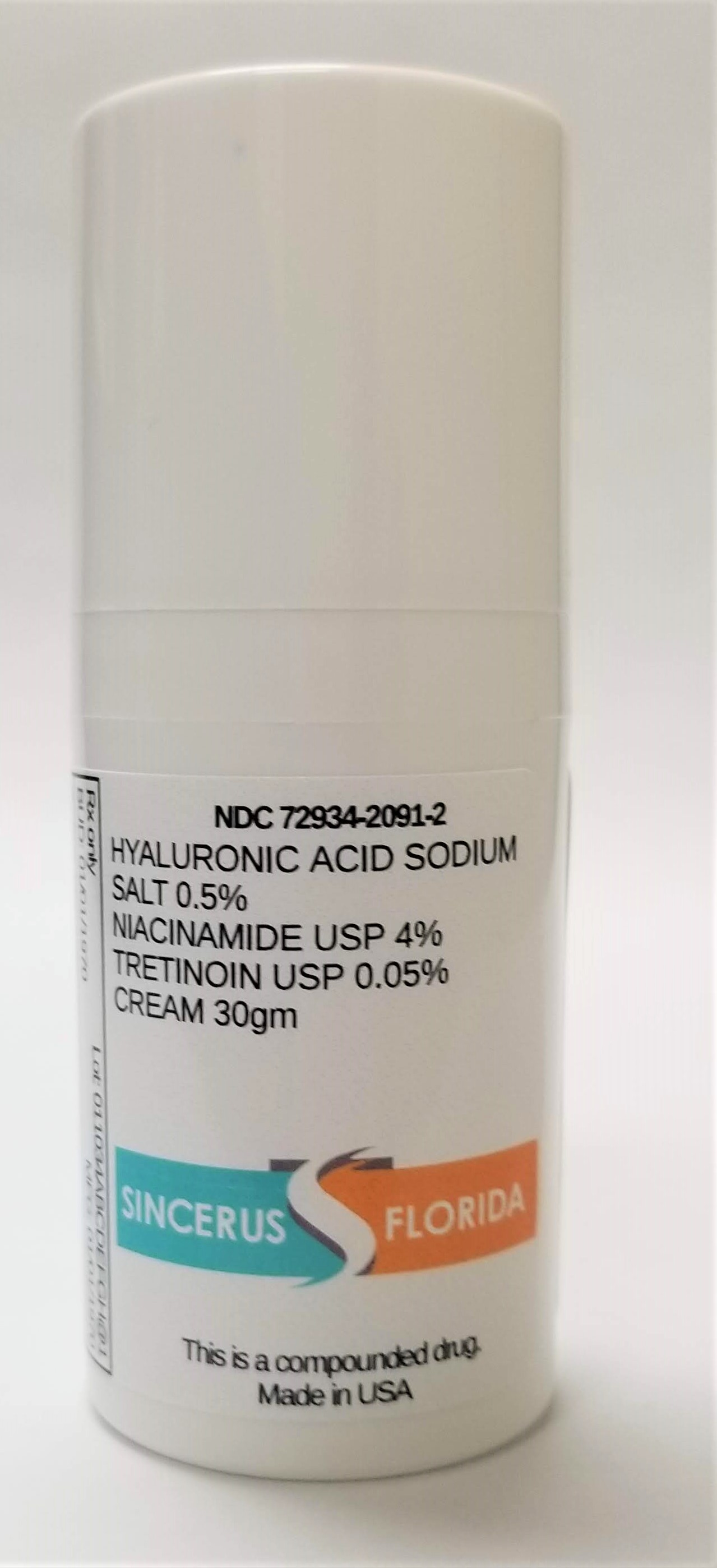 The following 3 images provide visual information about the product associated with Hyaluronic Acid Sodium Salt 0.5% / Niacinamide 4% / Tretinoin 0.05% NDC 72934-2091 by Sincerus Florida, Llc, such as packaging, labeling, and the appearance of the drug itself. This resource could be helpful for medical professionals, pharmacists, and patients seeking to verify medication information and ensure they have the correct product.