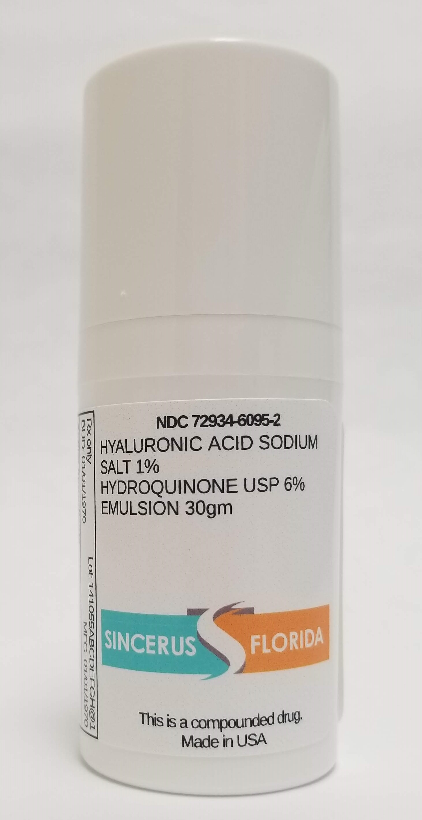 This is a compounded drug containing hyaluronic acid sodium salt 1% and hydroquinone USP 6% in an emulsion form with a net weight of 30gm. It has a unique NDC code of 72934-6095-2, and the manufacturer is based in the USA.*