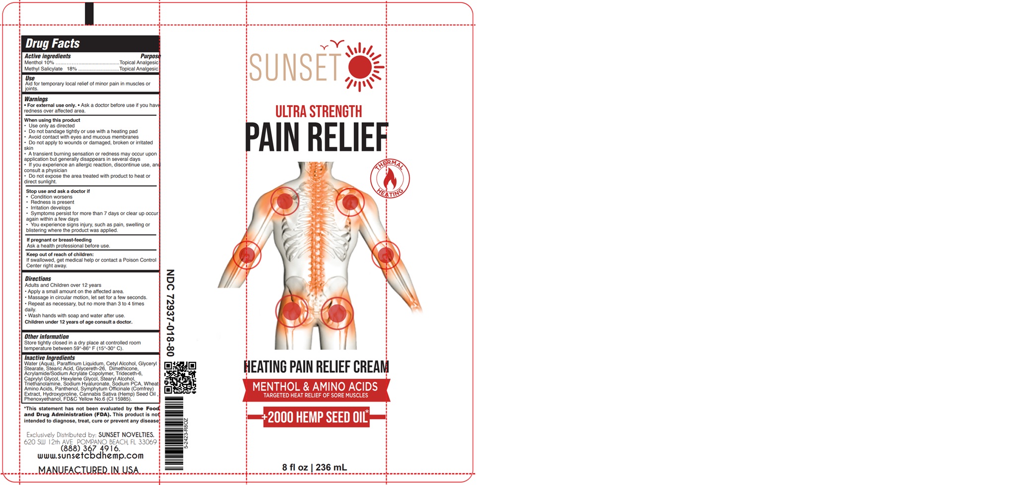 The following 2 images provide visual information about the product associated with Heating Pain Relief NDC 72937-018 by Sunset Novelties, Inc, such as packaging, labeling, and the appearance of the drug itself. This resource could be helpful for medical professionals, pharmacists, and patients seeking to verify medication information and ensure they have the correct product.