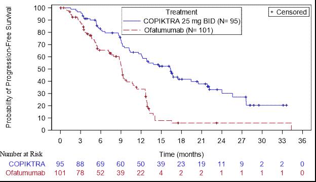 This appears to be a table or a graph showing the number of participants and their status in a medical study. The study compares the efficacy of two different treatments, COPIKTRA and Ofatumumab, for an unspecified condition. It also indicates the number of censored subjects, meaning those whose outcomes were not observed or recorded. However, the text is not clear and some characters are garbled, so the information is inadequate for further description or analysis.*
