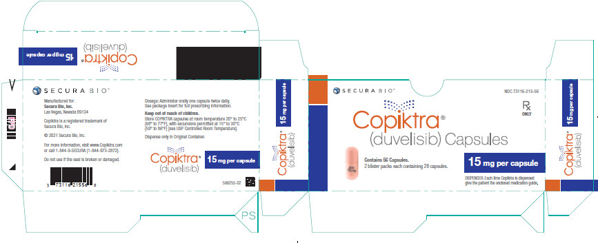 Copikira is a medication available in capsule form containing 15mg of duvelisib. Each package contains 28 capsules and is to be administered orally twice daily. The package is child-resistant and comes with a medication guide. It should be stored at room temperature between 20°C to 25°C. For more information, visit www.copikira.com or call 1-844-9-SECURA (1-844-973-2872). It is to be dispensed only in the original container.*